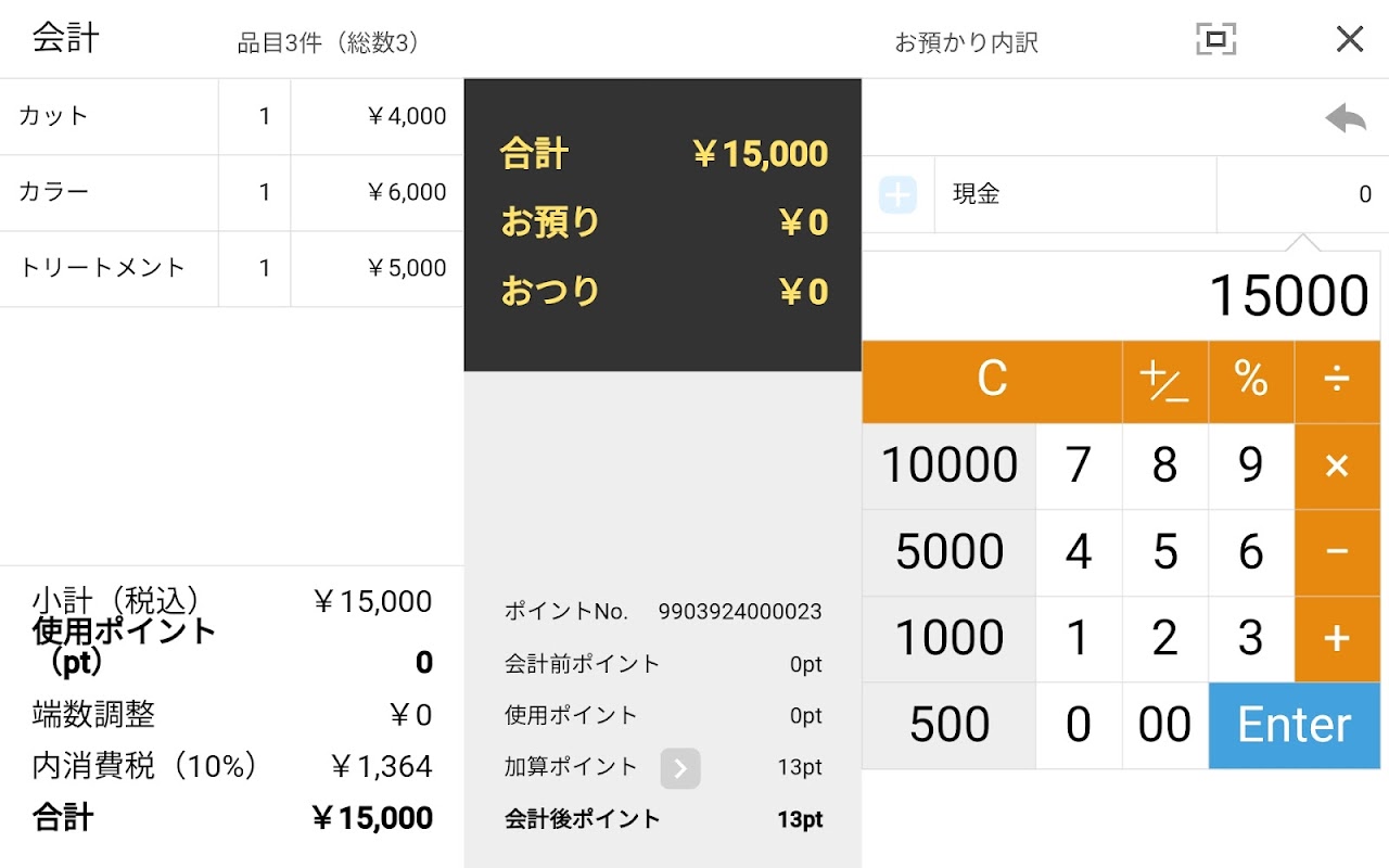 يمكن عرض شاشة كشف الحساب بملء الشاشة. نظرًا لعدم عرض القسائم والمعلومات الخاصة بالعملاء الآخرين ، يمكنك التحقق من المبلغ الإجمالي على الشاشة مسبقًا مع العميل قبل العلاج ، ويمكنك إجراء الدفع على الجانب المحدد.
