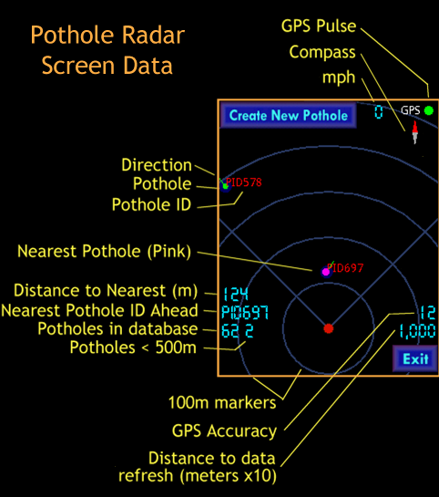 يستخدم التطبيق موقع GPS الخاص بك للعثور على الحفر تميزت أنت والآخرين في مكان قريب. ثم يرسم لهم على شاشة الرادار بالنسبة لك أن ترى ويعطي تحذير مسموعة لأنها تقترب. عندما حفرة في الطريق هو أقل من 50 مترا، يمكنك تأكيد ذلك هناك أو علامة على أنها مليئة.