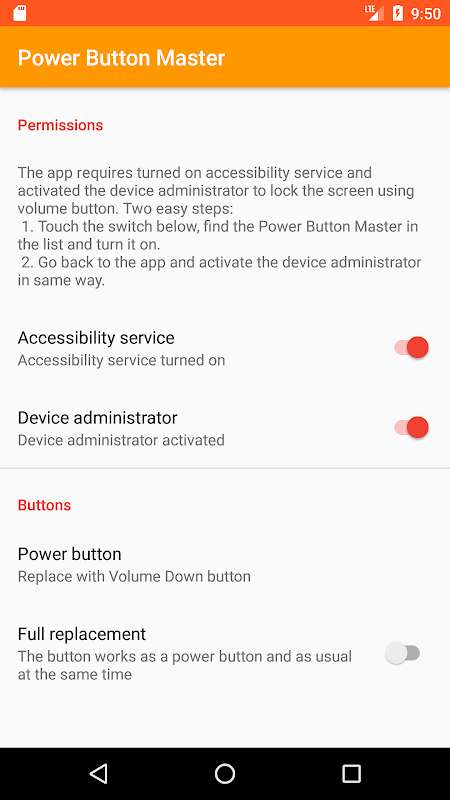 For the Power Button Master to work, you need to enable the accessibility service and activate the device administrator - two simple steps described on the start screen.