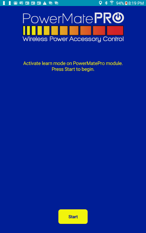 PowerMatePRO is the user interface app for use with the LogicBlue PowerMatePRO wireless power accessory control. This module is designed to be used to control motorized power accessories in a Recreational Vehicle (RV) such as power room expansion slides, power awnings, manual motorized power jacks and other similar products.