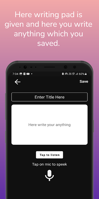 ويعمل هذا التطبيق مثل المفكرة. في المفكرة، اكتب شيئًا مثل هذا الذي تكتبه أيضًا، وعندما تحفظ الكثير من المعلومات، فإنك لا تجد ملاحظاتك بسهولة، لذا قم أيضًا بتوفير مربع بحث للبحث في ملاحظاتك.
