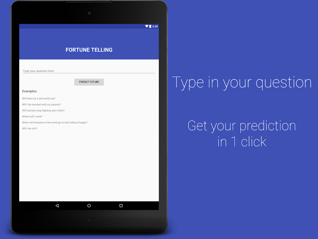الجميع متحمس جدا حول مستقبلهم وأنها بحاجة نعرف ماذا سيحدث. وقد تم تصميم هذا التطبيق لخدمة هذا الغرض. فقط اكتب في ما تحتاج إلى معرفته. مثال: هل سيكون هناك حرب عالمية 3RD؟ وسهولة الحصول عليها وتوقع.