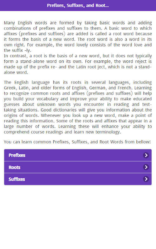 يمكنك معرفة البادئات واللاحقات الشائعة والجذور الشائعة من تطبيق Android الخفيف الوزن.