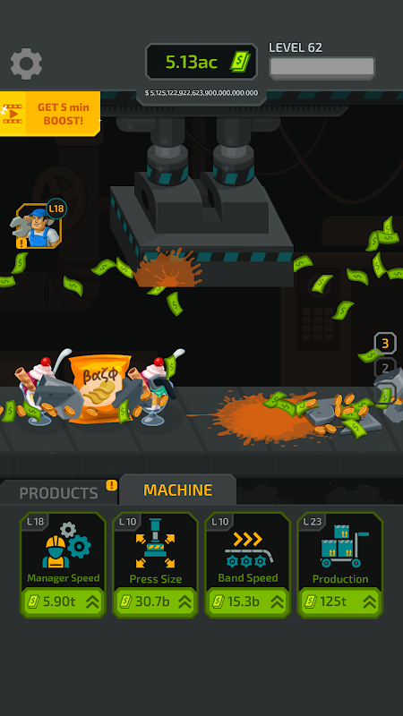 Destroy products in the most satisfying way. Upgrade your machine and increase your factory's income.
