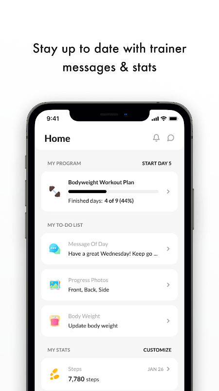 من الصفحة الرئيسية، يمكنك الاطلاع على رسائل مدرب اللياقة البدنية، وإحصاءات اللياقة البدنية اليومية، واستعراض نظامك الغذائي اليومي. في هذه الصفحة، نعمل أيضًا مع تطبيق Apple Health لتتبع خطواتك والسعرات الحرارية المحروقة.