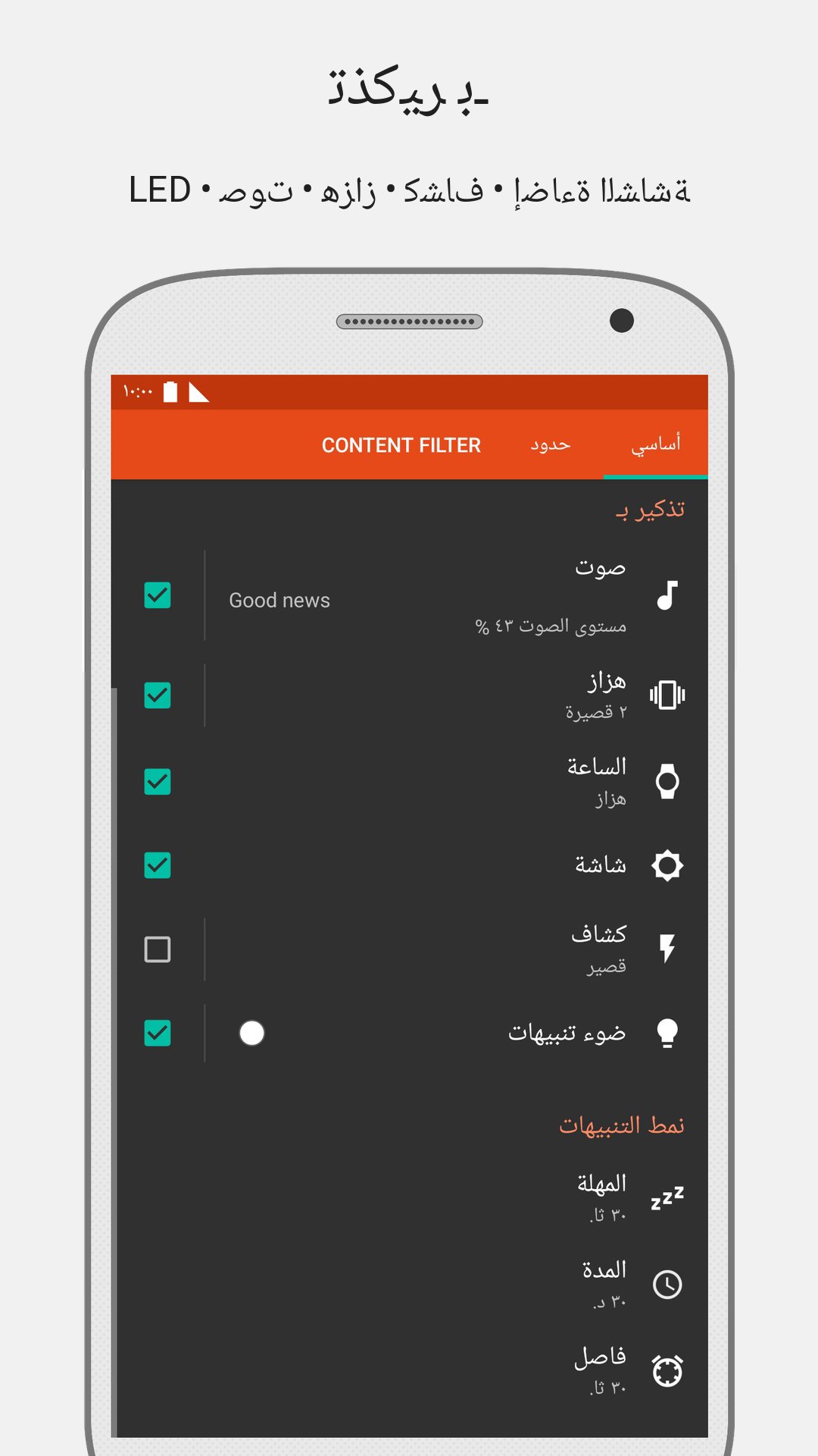 ★ يذكرك عن طريق: الصوت, الهزاز, إضاءة الشاشة, كشاف الكاميرا (ليست كل الأجهزة مدعومة), وضوء التنبيهات.