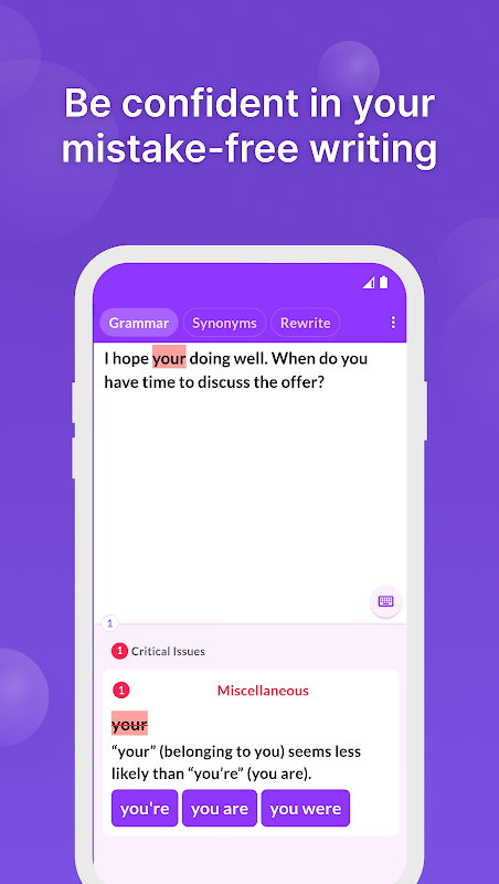 • إعادة الكتابة باستخدام الذكاء الاصطناعي - صحح واكتشف طرقًا جديدة لإعادة صياغة الجمل. احصل على اقتراحات إعادة صياغة متنوعة للارتقاء بأسلوبك وإبداعك. بالإضافة إلى ذلك، يمكنك الكتابة بأي لغة أجنبية، والترجمة إلى اللغة الإنجليزية، وتلقي توصيات إعادة الصياغة بنقرة واحدة.