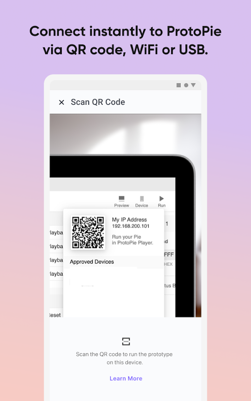 لفتح النماذج الأولية على جهاز Android الخاص بك، قم بتوصيل ProtoPie Player بـ ProtoPie Studio عبر WiFi أو USB. أو قم فقط بتسجيل الدخول باستخدام حساب ProtoPie الخاص بك للوصول إلى النماذج الأولية الخاصة بك في السحابة.
