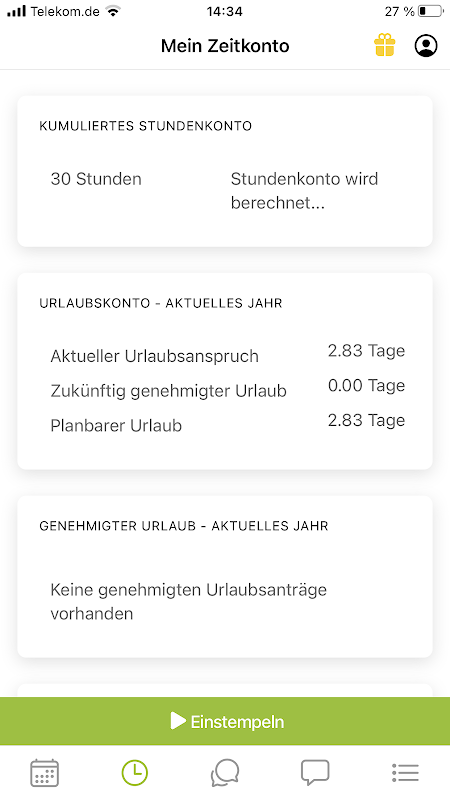 حساب وقتي: هنا يمكنك الوصول إلى معلومات مهمة حول العمل الإضافي الخاص بك ، وحساب إجازتك بما في ذلك الإجازة المعتمدة ، بالإضافة إلى إدخالات وقت العمل المختومة اليوم.