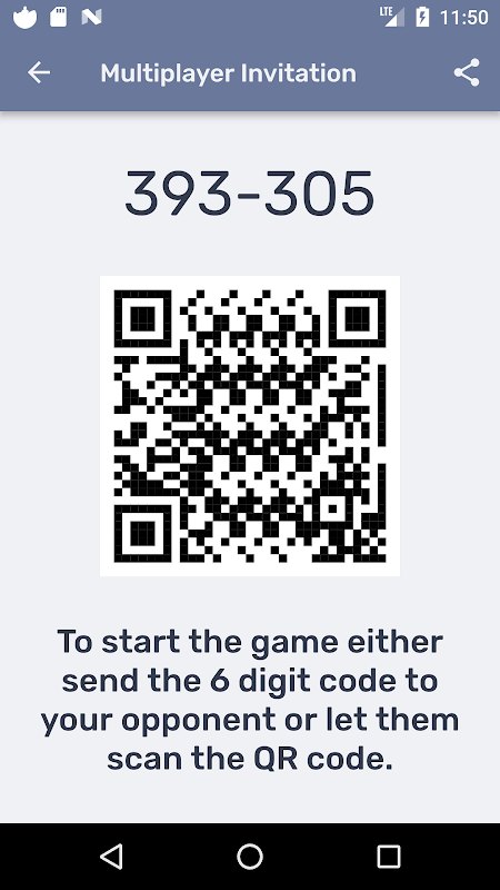هنا تبدأ المتعة الحقيقية! ما عليك سوى إنشاء لعبة، إما بمشاركة رمز اللعبة أو السماح لخصمك بمسح صورة رمز الاستجابة السريعة، وهذا كل شيء - تبدأ اللعبة!