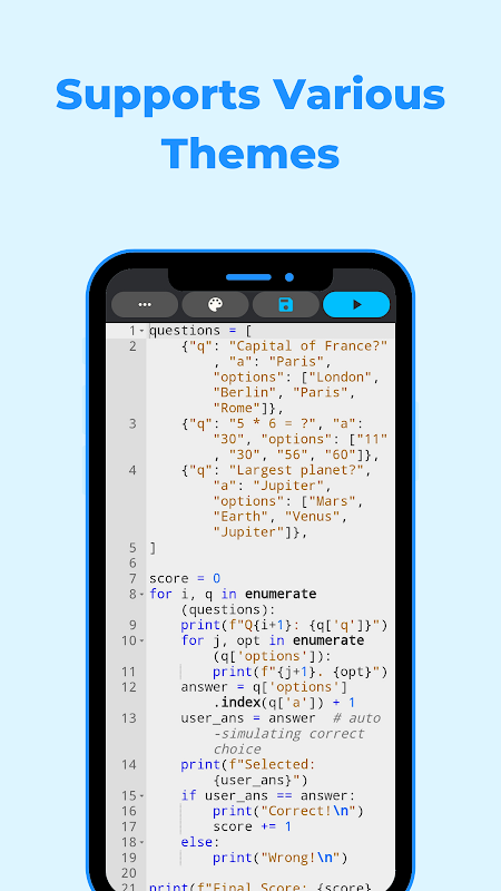 اختبر قوة برمجة Python على جهازك المحمول باستخدام Python IDE. يقدم هذا التطبيق عالي السرعة نتائج دقيقة بكفاءة استثنائية. تضمن واجهة المستخدم الأنيقة والبديهية تجربة برمجة سلسة، ليلاً أو نهارًا.