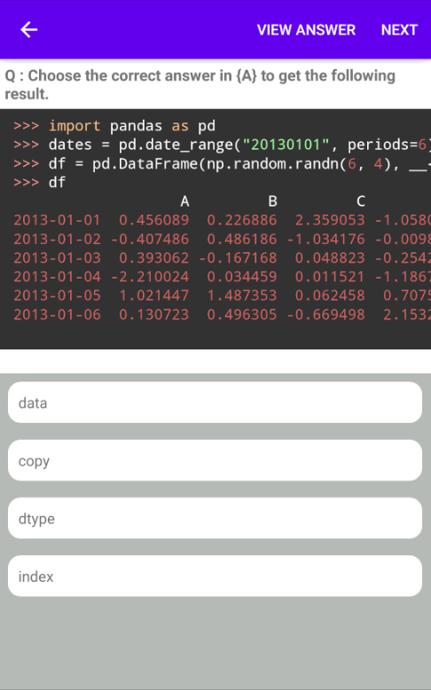 حاليًا ، يحتوي هذا التطبيق على اختبارات حول مكتبة Numpy ، Pandas.