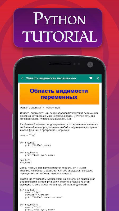 دليل "Python tutorial" سيعلم المبادئ الأساسية للبرمجة على مثال "المهام والأمثلة". ستكتسب المهارات اللازمة لتطوير التطبيقات في Python وستتعلم كيفية تطبيقها في الممارسة العملية.