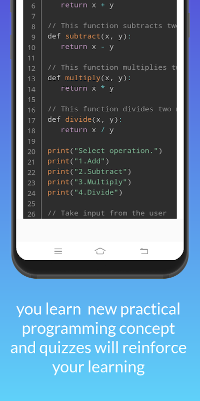 لقد صممت تطبيق برمجة Python هذا ليتم فهمه بسهولة من قبل المبتدئين والشباب. نبدأ بمفاهيم برمجة بايثون الأساسية.