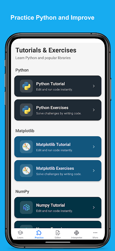 بايثون+ هو تطبيقك الشامل لتعلم بايثون دون اتصال بالإنترنت، مع مسار تعليمي منظم بشكل رائع، ودروس تعليمية تفاعلية، وتدريب عملي، وتحديات، وبيئة تطوير متكاملة (IDE) متكاملة الميزات. أتقن بايثون على جهاز أندرويد الخاص بك - من الطباعة ("أهلاً بالعالم!") إلى تحليل البيانات الواقعي والتعلم الآلي.