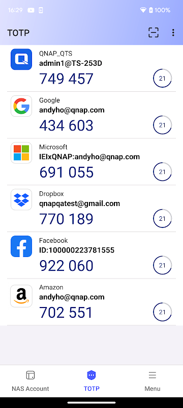 تتطلب الموافقة على تسجيل الدخول ورمز QR ورمز التحقق عبر الإنترنت اتصالاً بـ NAS الخاص بك، بينما يمكن لـ TOTP العمل دون اتصال بالإنترنت. تدعم هذه الطريقة أيضًا التحقق من حسابات الجهات الخارجية من Google وMicrosoft وFacebook وGitHub ومقدمي الخدمات الآخرين الذين قاموا بتنفيذ المصادقة الخاصة بهم وفقًا لمعيار TOTP.