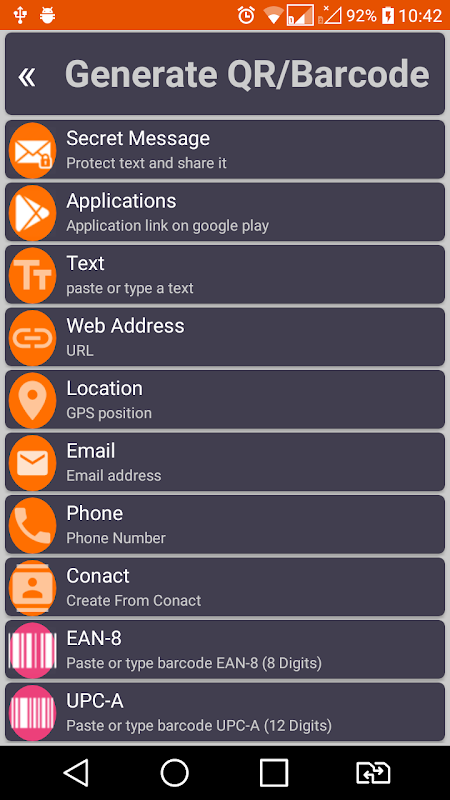 QR: URL - النص - البريد الإلكتروني - الهاتف - الرسائل القصيرة - VCARD - الموقع - WIFI