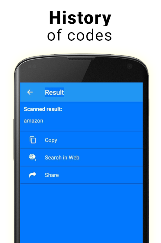 سيتم تخزين جميع النتائج الممسوحة ضوئيًا في قاعدة البيانات المحلية لاستخدامها في المستقبل. سيكون التاريخ مرئيًا في قائمة بسيطة. يمكن للمستخدم نسخ النتيجة إلى الحافظة للمستخدم في مكان آخر. يمكن للتطبيق اكتشاف عنوان URL على الويب بذكاء. إذا تم العثور على عنوان URL على الويب كنتيجة ممسوحة ضوئيًا ، فسيتم إعادة توجيهه إلى متصفح الويب مباشرة.