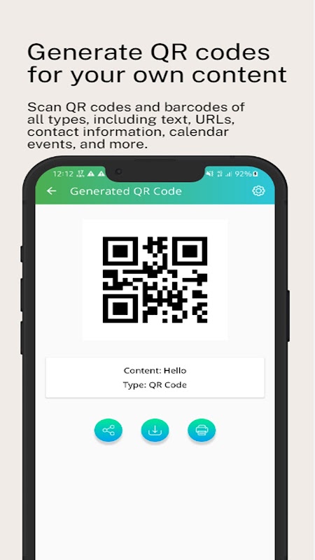 ماسح رمز QR لنظام Android، تطبيق ماسح الباركود هو أيضًا منشئ رمز QR في جيبك. يعد استخدام مولد QR سهل الاستخدام للغاية، ما عليك سوى إدخال البيانات التي تريدها على رمز QR والنقر لإنشاء رموز QR.