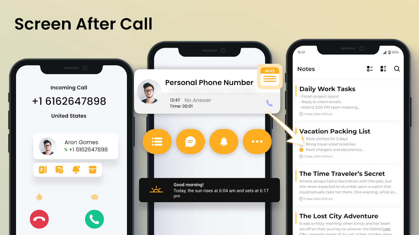 بعد شاشة الاتصال: ملاحظات سريعة - يمنحك Secure Notebook خيار تحديد المكالمات الواردة فور حدوثها حتى تتمكن من كتابة ملاحظة سريعة وحفظها، وتعيين تذكير على الملاحظات فورًا بعد المكالمات الواردة.