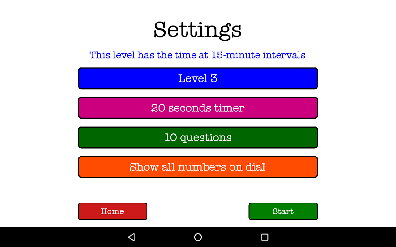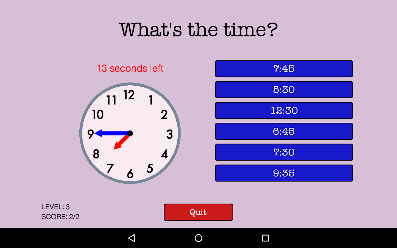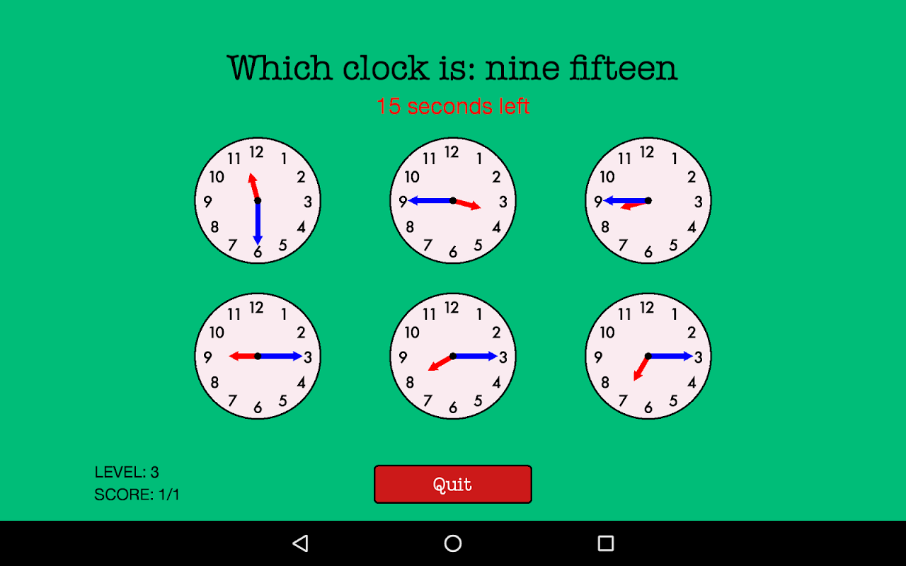 - مستويات صعوبة مختلفة، من اختبار الساعة فقط، إلى اختبار الوقت عند علامات الدقائق المختلفة على الساعة.