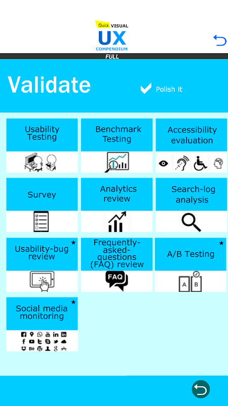 Quick Visual UX Design is a quick reference for junior or senior UX designers. Quick Visual UX Compendium explains the different steps on a UX iteration. You can decide which steps are suitable for your project. Quick reference for any User Experience Designer or User Experience student. Also with the most important concepts for User Interface(UI), Interaction Design (IX) and Information Architecture (IA).