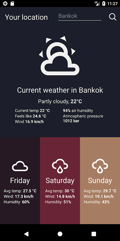 The app will show you basic weather information like current degrees, what the temperature actually feels like, wind speed, air humidity, atmospheric pressure and additional 3 days weather forecast.