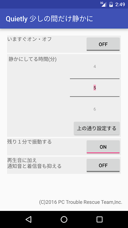 少しの間(1分〜99分の任意の間)だけ音量をゼロにして静かにしておくための単純なアプリです。たとえばゲームをする間だけスピーカーから音を鳴らさないようにしたいときに使います。