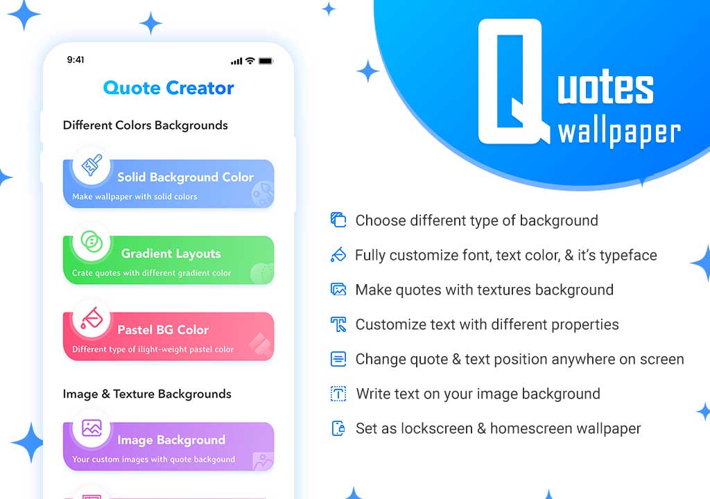 💃 Add text on the image of your choice and set it as wallpaper. Customize background with your choice of Text, Texture & Background image. You can create Art wallpaper, Gradient wallpaper, Solid color wallpaper, Texture wallpaper, Pattern wallpaper, Customized wallpaper, Custom wallpapers, Classy wallpaper & easy Text wallpaper with Quote Maker smart App.