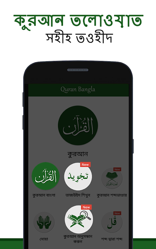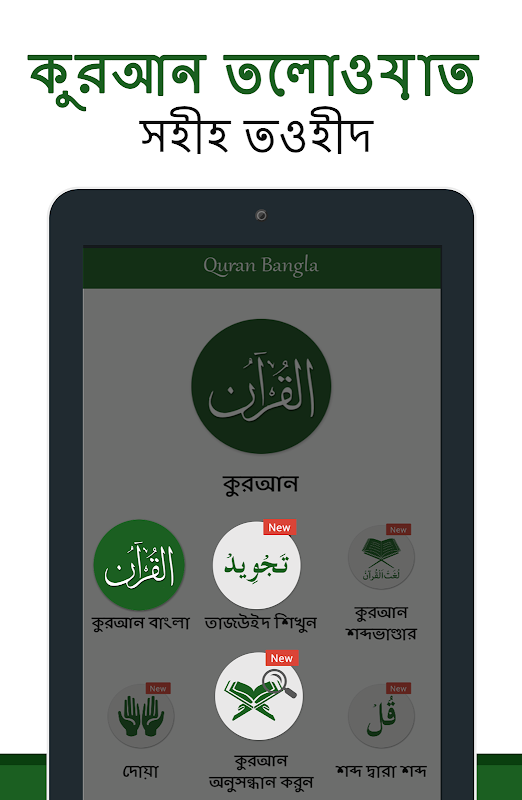 توفر وحدة القرآن البنغالية التلاوة الودية للقرآن مع ميزات سهلة التمرير ، والتي تشمل تغيير حجم الخط والأسلوب وتغيير اللغة الإنجليزية بخلاف Bangle والتحويل الصوتي والترجمة البنغالية وتلاوة صوت mp3.