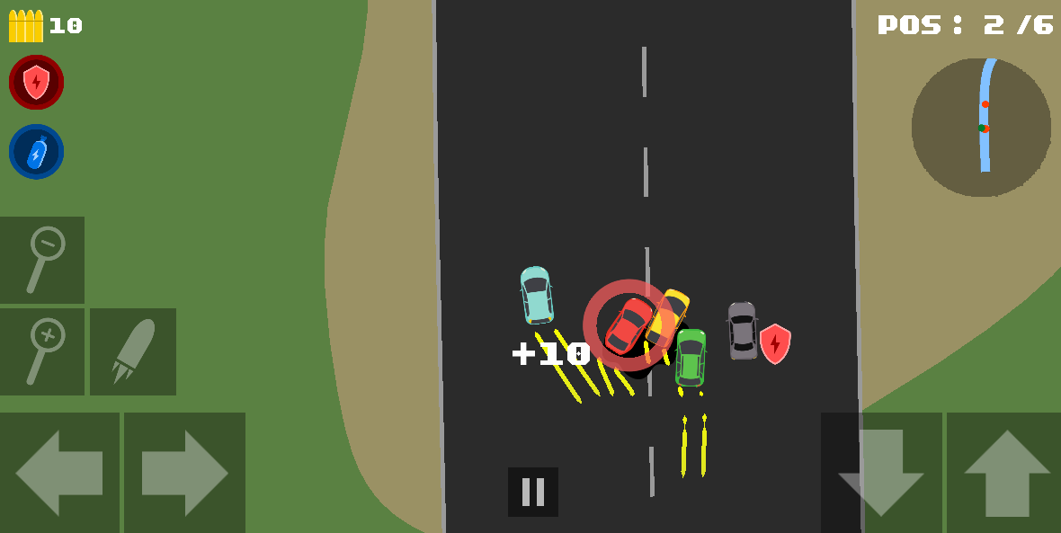 This is a simple 2D top down car racing, with shoot ability, your goal is just win the race at least at 3th position, the count of race and wins (at 1, 2 or 3) will be recorded, you can see it in "Race Stats" on home screen. Collect bullet, shield, and nitro on the road and stay away from oil that retard you. If you want to race in fast mode, ignore oil, and can collect nitro from longer radius, you can watch the ads to unlock these features