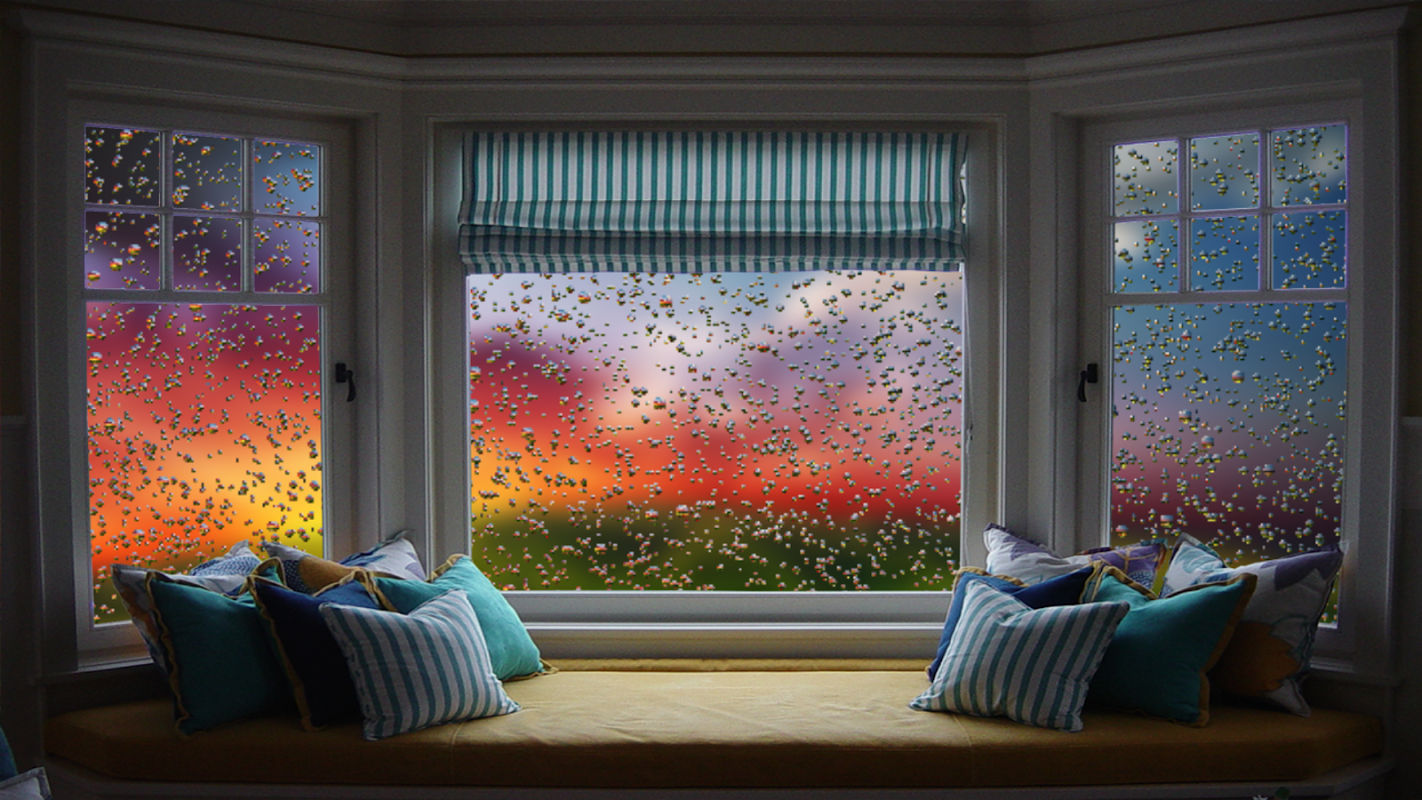 نافذة الأمطار واقعية مع قطرات، والصوت، مع وجهات نظر مختلفة والنوافذ.