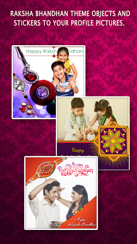 When you want to wish Raksha Bandhan you always send a simple text saying Happy Raksha Bandhan or most probably you would be sending some quotes but with our latest application "Raksha Bandhan Photo Frames Dual" you can send images in a form of photo frames of both brother and sister to your sibling which helps them to restore their lovely Raksha Bandhan memoires with them throughout the life.