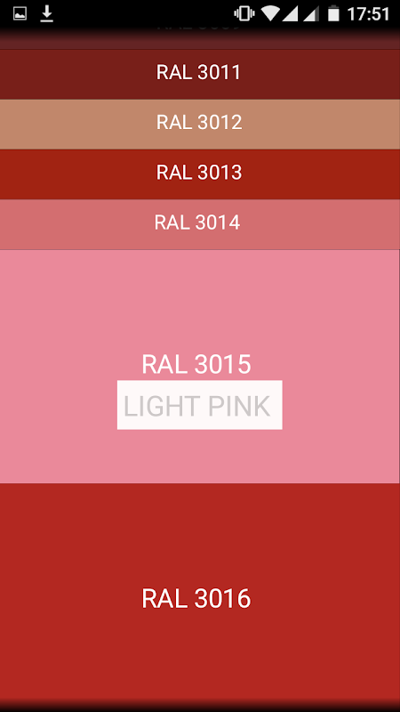 Az alkalmazás a Classic RAL rendszer szerinti szabványos színek áttekintését jeleníti meg, kódokkal, írásban és kimondva.