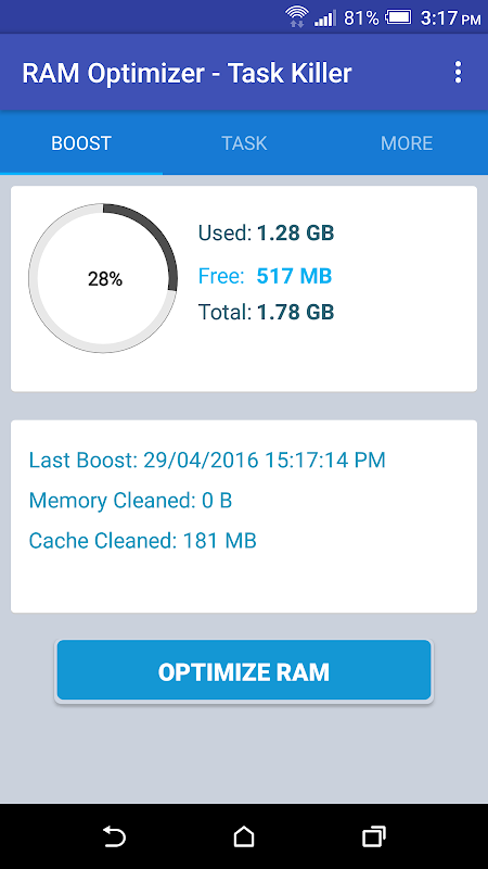 Thank for use RAM Optimizer - Task Killer app. Don't forget give us 5 stars + your feedback.