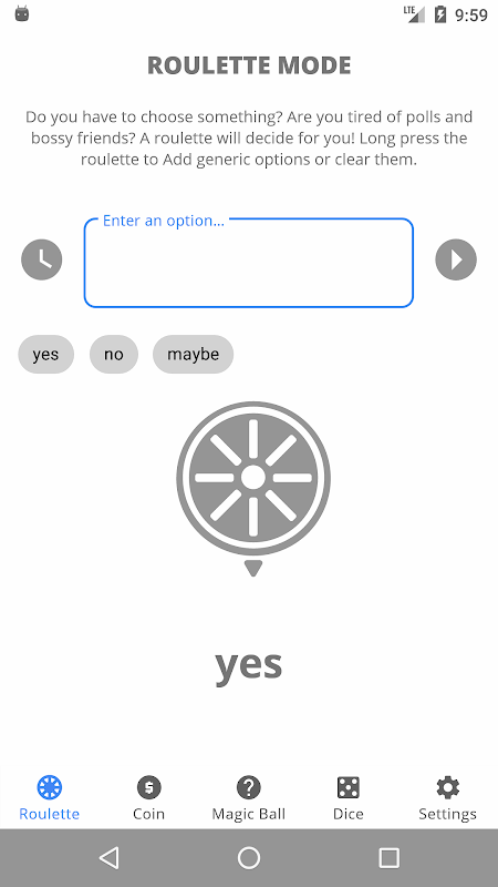 The main purpose of the app is to provide a random choice in different ways.
