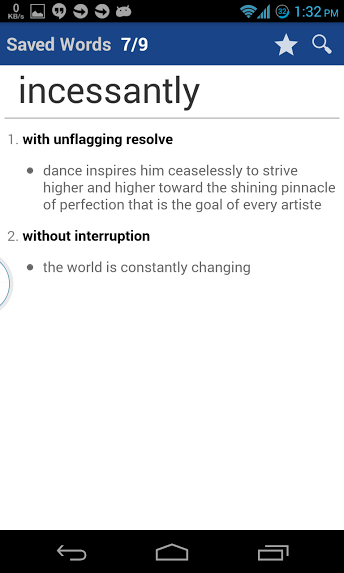 ابحث في تعريفات الكلمات ، واحفظها مع استخدامات مثالهم. يمكنك أيضًا عرض الكلمات المحفوظة لاحقًا مع اسمها ، مما يساعدك على تذكر الكلمة بشكل أكثر فعالية.