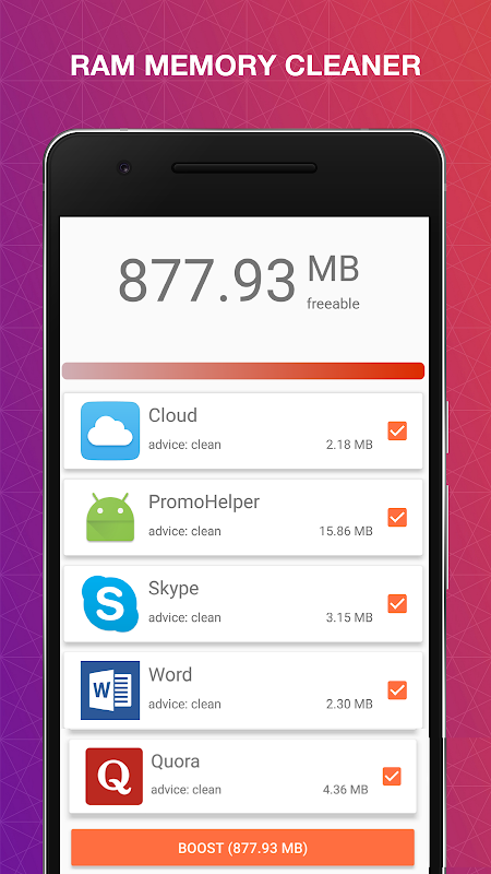-> Memory Boost: Cleans up unused applications from the RAM and thus speeds up your phone at runtime.