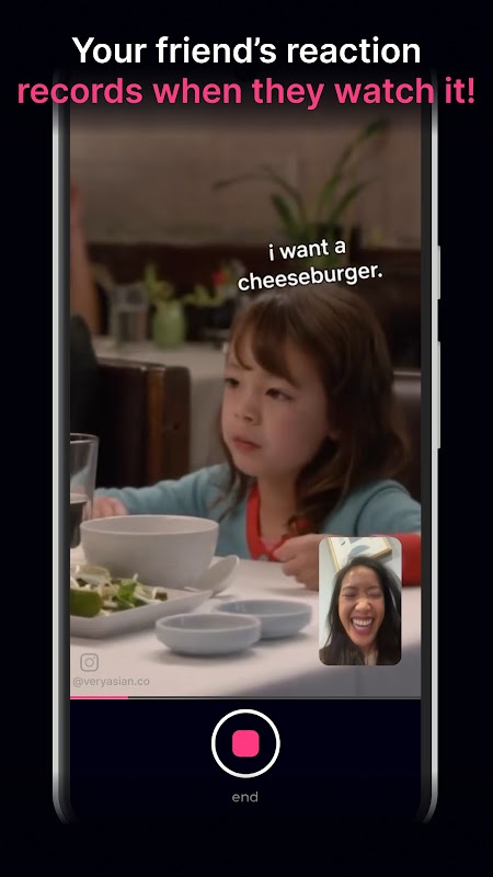 يلتقط ReactApp ردود فعل واقعية من أصدقائك! شارك الميمات والصور ومقاطع الفيديو والمشاركات - وحتى الرسائل مع أصدقائك. عندما يشاهدونها، يلتقط ReactApp ردود أفعالهم وتحصل على مقاطع فيديو ردود أفعالهم غير المفلترة! انها الكثير من المرح! ردود الفعل خاصة بينك وبين أصدقائك.