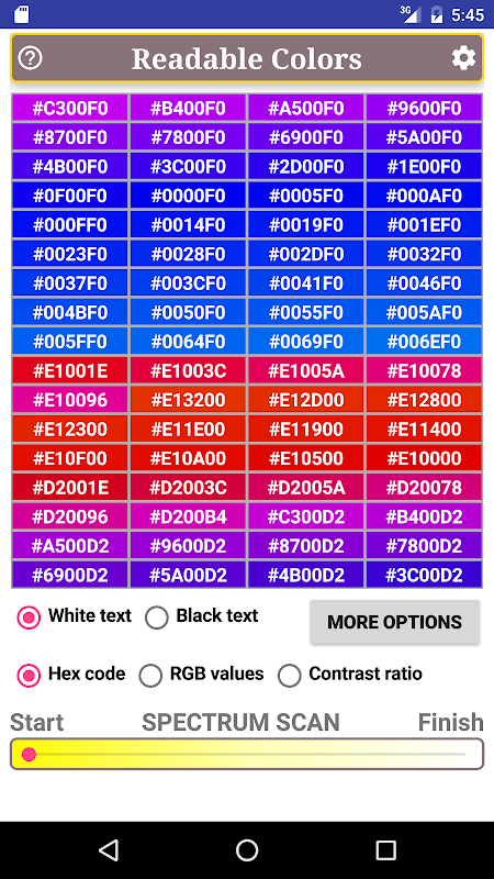 This app uses the W3C formula to help you find background colors for black and white text. You can quickly scan through virtually all available colors within the specified minimum standard. These colors you can sort by hue, by saturation, or by brightness in the HSV color system. This app also shows you either the Hex color code, or the RGB values, or the contrast ratio for all available colors.