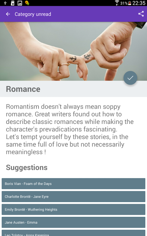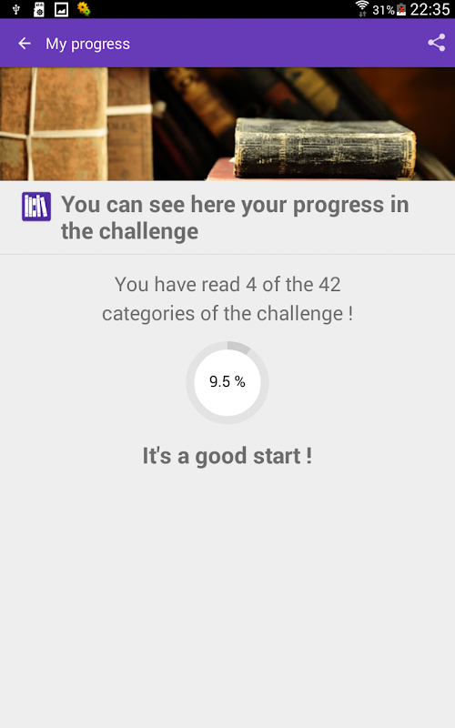 هذا التطبيق يساعدك على تحقيق التحدي القراءة. كل كتاب يجب أن تنسجم مع موضوع معين. قراءة كتاب واحد على الأقل من كل موضوع وتحقيق هدفك!