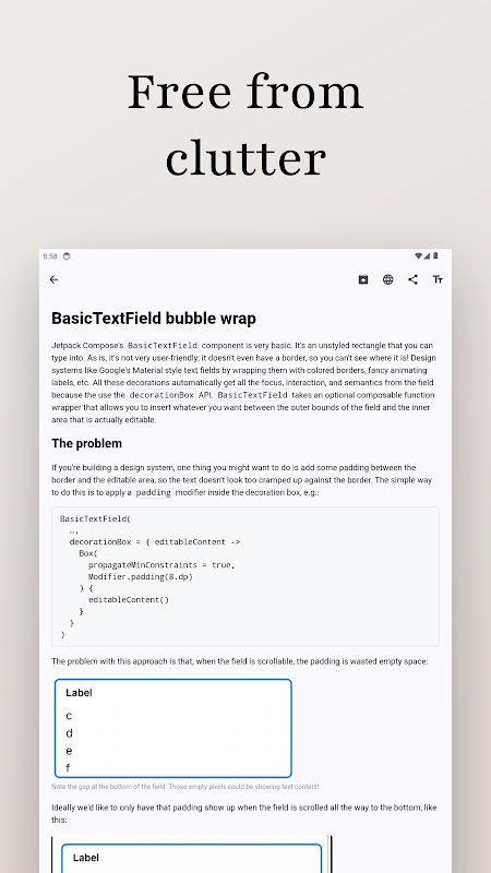 يُقدم تجربة قراءة سلسة وخالية من أي تشتيت، وذلك من خلال التخلص من الفوضى غير الضرورية، وترك المحتوى المهم فقط، كل ذلك مُخزنًا على جهازك. بيانات قراءتك لا تُغادر جهازك أبدًا.