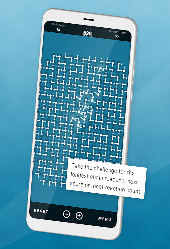 عندما يبدأ التفاعل ، ستلاحظ كيف يتم ترتيب بنية الجزيئات ، وتتضاعف نقاطك. كلما طالت مدة التفاعل وكلما زاد عدد الجزيئات المشاركة في كل تكرار ، زادت النقاط التي ستحصل عليها. يمكنك التنافس مع أصدقائك أو المشاركة في التحدي العالمي عن طريق إرسال نتائجك إلى المتصدرين عبر خدمات ألعاب Google Play. يمكنك تتبع تقدمك الشخصي في قسم خاص ، حيث يتم عرض بعض الإحصائيات عن أفضل إنجازاتك.
