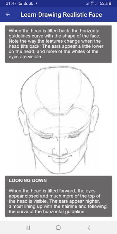 يحتوي هذا التطبيق "Realistic Face Draw Tutorials" على بعض النماذج لكيفية رسم وجه بشري واقعي ، وستعطيك الكثير من الإرشادات لرسم نماذج وجه واقعية ترغب فيها. بعض دروس رسم الوجوه الواقعية المتوفرة في هذا التطبيق هي: