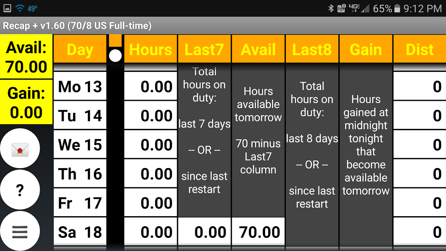7) Enhanced grid with explanations in the Last 7, Avail, Last 8, and Gain columns, just like in your logbook. The enhanced grid also now displays the professional drivers most needed recap data for TODAY (ie. the last day in the recap grid): 1) how many hours the driver has available to drive today, and 2)how many hours they will pick up at midnight, in two oversized highlighted fields. Once on-duty hours are entered for Today, these fields will be replaced by the regular recap grid fields. Until then, a driver can see this data at a glance. Glance at it in the morning to assist you in your trip planning.