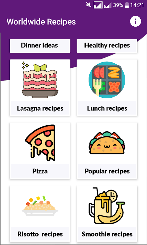 Recipy is the easiest way to get the recipes you need, just open the application and you will find the most popular food categories: