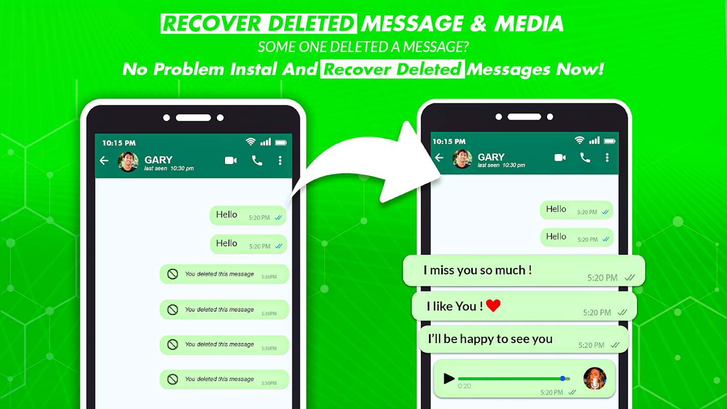 Using Deleted Messages Recovery app, you will able to retrieve deleted text messages and restore media files (videos, pictures, audio, voice notes, animated gifs and stickers)!