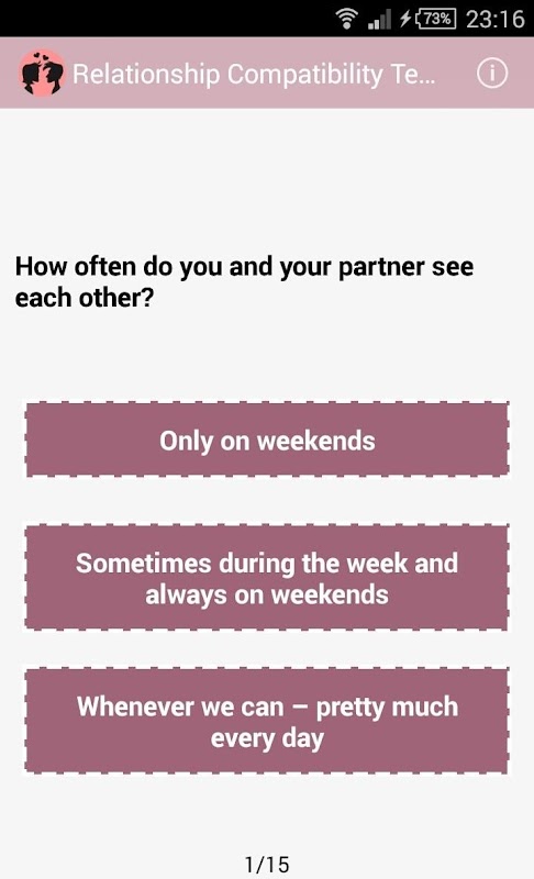 أتساءل إذا كنت وصديقها الخاص بك أو صديقة متوافقة؟ ثم عليك أن تحاول هذه قصيرة اختبار التوافق علاقة للأزواج. سيكون لديك لاختيار بين أسئلة مختلفة، على سبيل المثال كيف وغالبا ما تشاهد بعضها ببعض، وكيف اتخاذ قرار بشأن ما يجب القيام به وأين تذهب بسهولة، كيف جيدا هل تستطيع التعامل مع التوتر وهلم جرا، وسوف تحصل على درجة التوافق الخاص وشرحا موجزا.