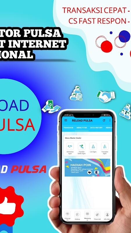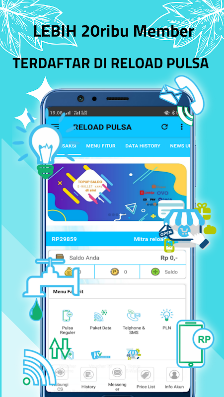 تطبيق RELOAD PULSA android هو تطبيق مجاني للهاتف المحمول للأعضاء المخلصين RELOAD PULSA أينما كانوا. يسهل هذا التطبيق عليك إجراء معاملات مختلفة مثل زيادة الرصيد ، وشراء الرموز الكهربائية ، ودفع فواتير الدفع الآجل ، وشراء قسائم الألعاب ، وما إلى ذلك.