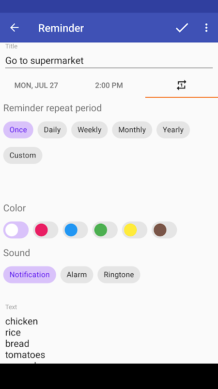 The reminder will notify you at time. You can also add a note text to the reminder.